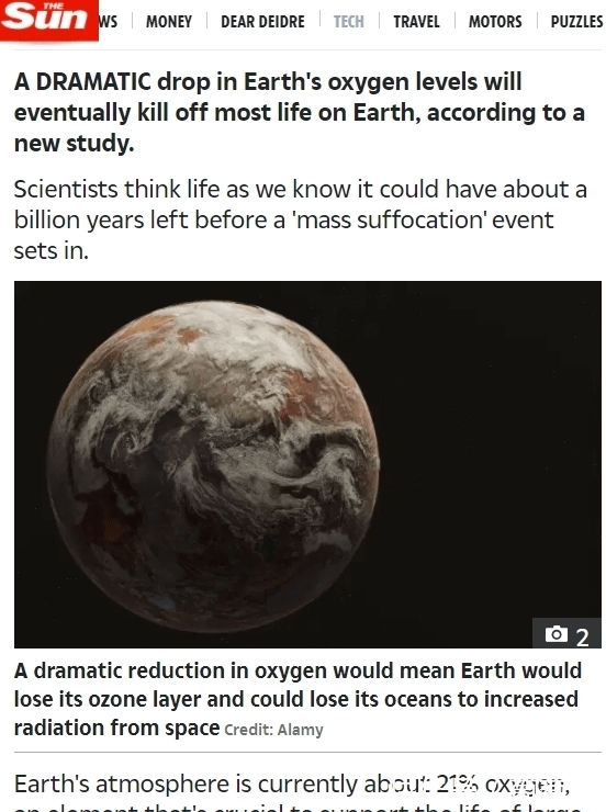 根据太阳报文章表示,一个新的研究发现,地球氧气水平的急剧下降最终将杀死地球上的大多数生命。大家也知道,我们现在很多的生命的生存都无法离开氧气,目前地球的氧气含量约为21%左右。所以氧气的重要性不言而喻。